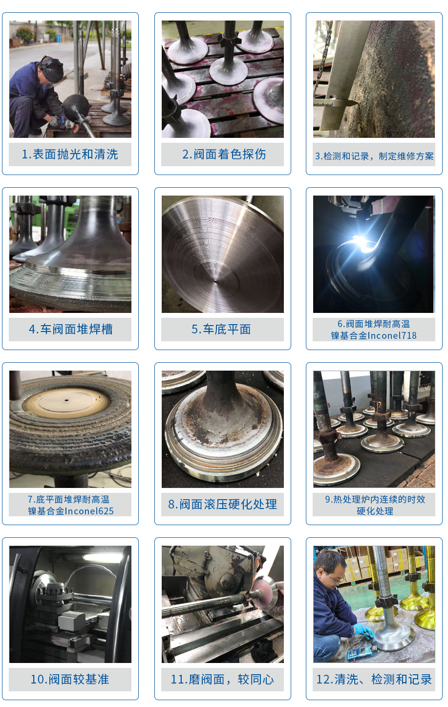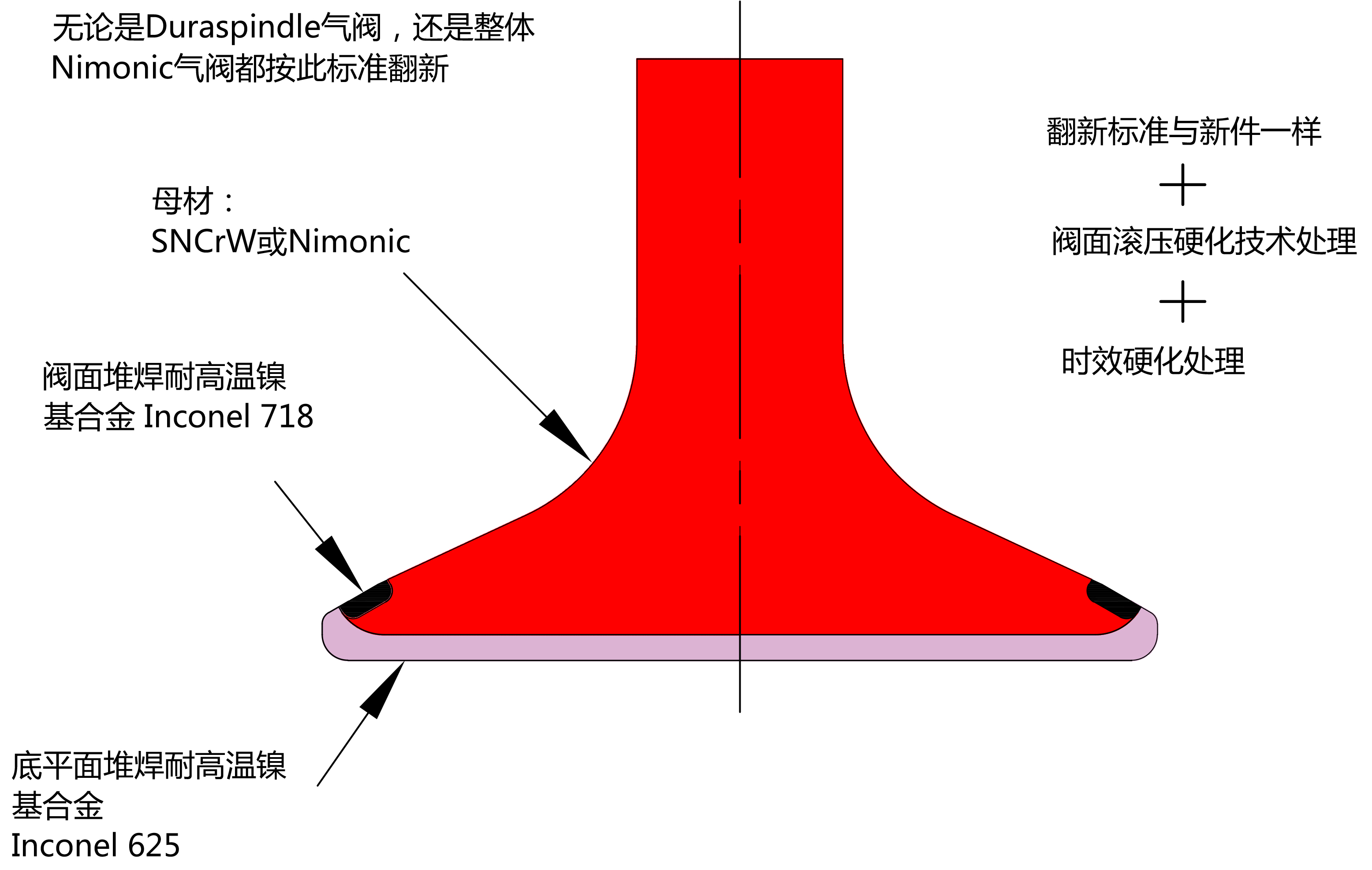 高斯通的翻新工艺严格按照MAN公司规范要求,Duraspindle和整体Nimonic气阀翻修工艺跟新件制造相同,阀面、底平面堆焊耐高温镍基合金,经过阀面滚压硬化和时效硬化热技术处理,使气阀阀面达到技术规范要求。