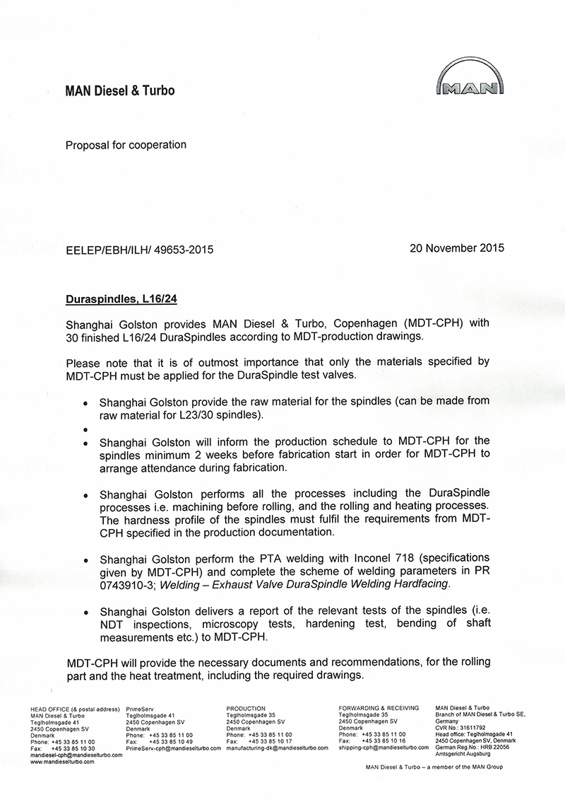 2015年11月MAN公司委托高斯通结合自身气阀制造专利技术,研发新一代四冲程柴油机高性能气阀,进一步提高气阀安全可靠性、延长使用寿命。