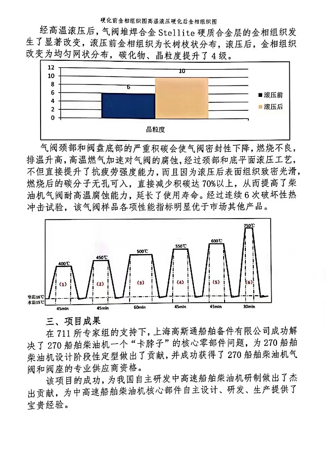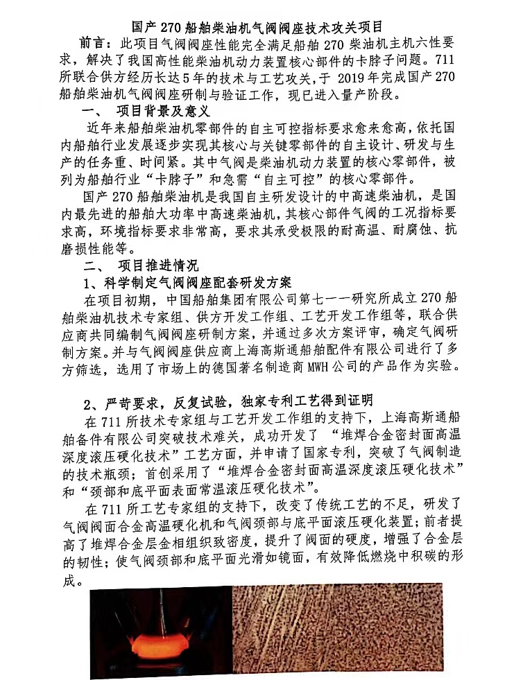 我司的专利技术“堆焊合金密封面高温深度滚压硬化技术”和“颈部和底平面表面常温滚压硬化技术”成功解决了270船用柴油机气阀——“卡脖子”的核心零部件问题,为270 船用柴油机定型作出了贡献,并成功获得了270船用柴油机气阀阀座唯一专业供应商资格。