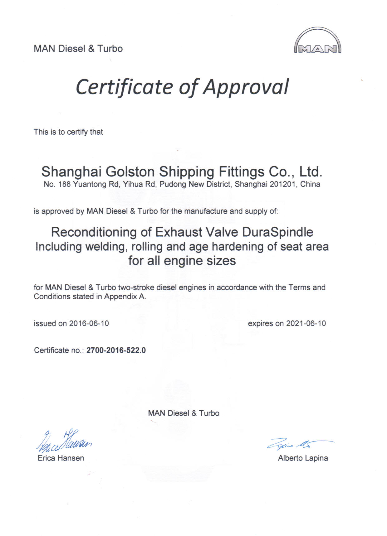 2016年6月10日,我司的气阀翻新技术获得了MAN Diesel & Turbo公司的全系列二冲程低速机气阀翻新认证。同时MAN Diesel & Turbo公司授权我司为国内首家定点维修厂家。