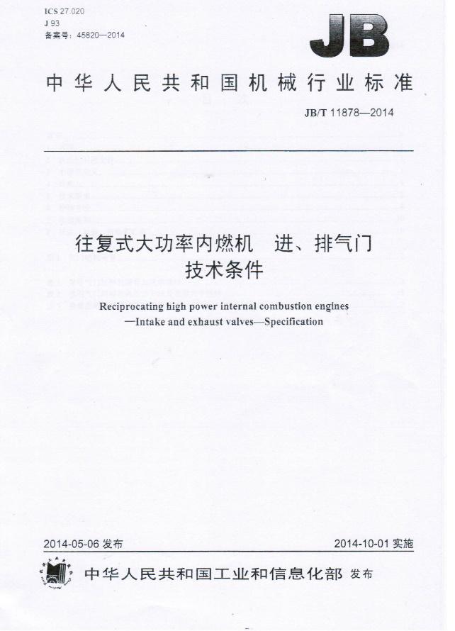 由我司牵头起草的中华人民共和国机械行业标准:《往复式大功率内燃机 进排气技术条件》于2014年5月6日发布,并将于2014年10月1日正式实施。